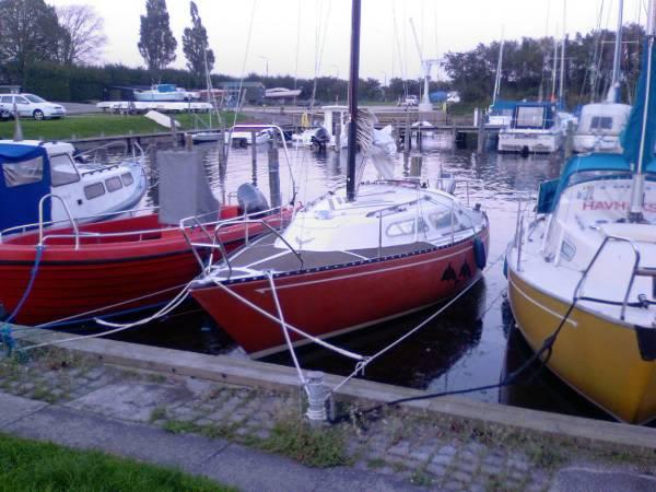 L 23 sejlbåd fra 78 sælges. Der er 3 storsejl, 2 genuaer, 2 fokke og en spiler. Sejlene er ikke nye, men i orden. Der er desuden en rimelig ny 5HK 4 takt Honda påhængsmotor, ny bompresenning og nyere sprayhood. Hele apteringen er sat i stand for 3 år siden samt nyere log, ekkolod og kompas. Alt el i båden er nyt og trukket i min. 2,5´ ledning. Der er lavet nyt træarbejde ved nedgangslugen. Bunden er behandlet med kobber-epoxy hvilket gør at den ikke skal bundsmøres de næste 8 år, kun lige renses og slibes let. Der er de sædvanlige skøder og stort plovanker. Det er muligt at se skibet. Det ligger i havn på Vestlolland.