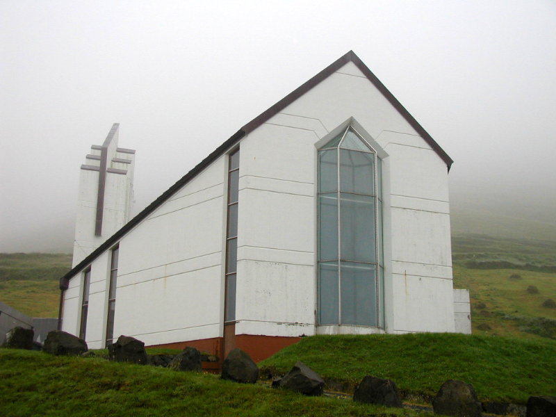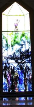 glasmaleri af Trondur Patursson fra Kirkjubø. Også lamperne inde i kirken er