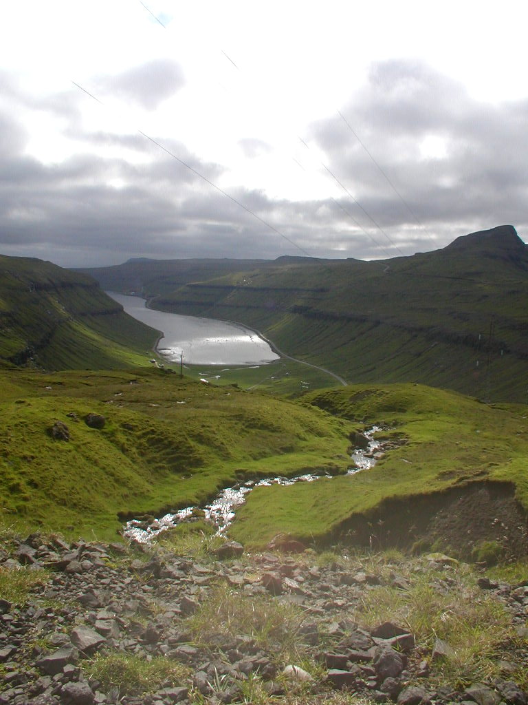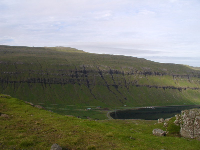 08,19:46 Fra bjergvejen rundt om Slættaratindur hen over Eiðisvatn mod Tjørnuvik.