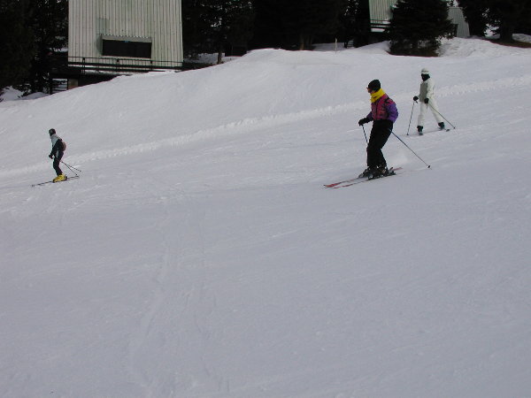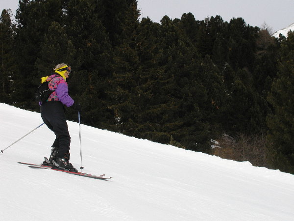 Men det betyder så at man løber med en sikkerhed selv når sigtbarheden er ringe, som man slet ikke kunne drømme om for nogle år siden. Samtidig er carvingskiene en absolut gevinst. De en klart kortere (jeg løb på 170cm) og bider alligevel lige så godt (snarere bedre) i svingene når man løber gammeldags, og så giver de denne helt nye carvingsvingsmulighed som er meget sjov og inspirerende. (I al beskedenhed (derfor sagt i parentes) syns jeg jeg løber bedre end nogensinde. Men tilskriver det i høj grad udviklingen i pister og ski. Annamarie var ikke helt tilfreds med min carving. "Nå??". "Dine armbevægelser er ikke yndefulde nok!" Javel så! yndefulde! Nå, det kan jeg leve med - i min alder, ikke mindst).