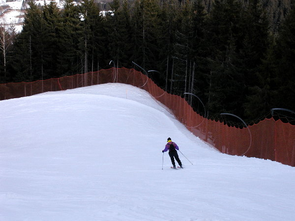 Cavaleses har et smukt skiområde ovenover skovene hvorfra træet, abete rosso (red spruce) til Stradivariusviolinerne blev hentet til værkstedet i Cremona. Der skis også igennem skovene. Her er Annamarie i respektløs fart på vej forbi. Her lidt mere besindigt (jeg skal huske at ånde indad når jeg fotograferer i 15 graders frost).
